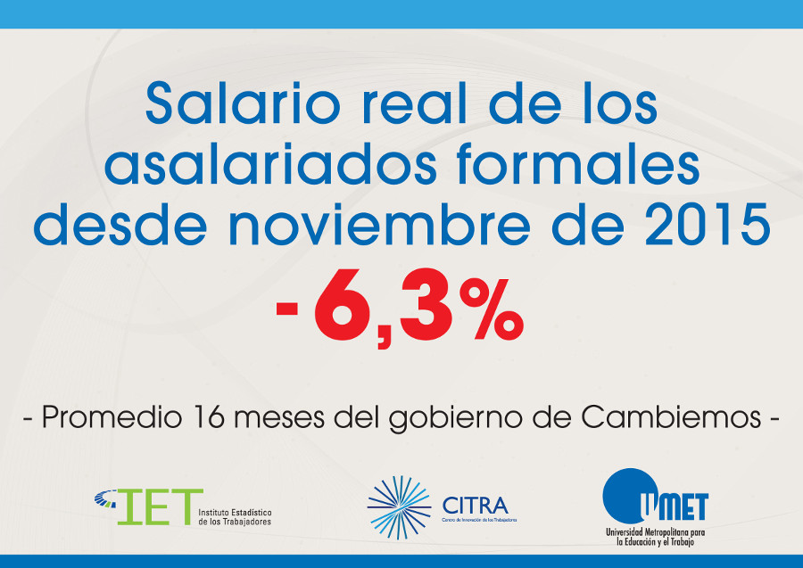 El informe, también reporta que el salario real de los asalariados formales desde noviembre de 2015 y lo que va de los 16 meses del gobierno de Cambiemos, tuvo una reducción en 6,3 por ciento.